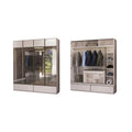 Гардеробът Pamukkale с широчина 203 см е модулно решение, което комбинира стилен външен вид със съвременна функционалност. Моделът се отличава със стъклени врати с елегантен опушен ефект и метална рамка, осигуряващи модерна визия и лекота при отваряне. Вътрешната конфигурация включва един широк лост за закачалки, множество рафтове за сгънати дрехи и аксесоари, както и специално отделение с органайзер за подредба на по-дребни вещи. Допълнително разполага с две големи чекмеджета в долната част за още по-голям капацитет за съхранение.