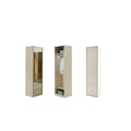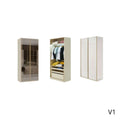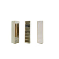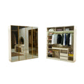 Модулите с широчина 51 см / дълбочина 62 см / височина 231 см предлагат компактно и адаптивно решение за съхранение. Налични са в две функционални версии: гардероб с рафтове – винаги в десен вариант, подходящ за сгънати дрехи, кутии и аксесоари, и гардероб със закачалка и рафт – наличен в ляв вариант, предназначен за окачени дрехи и ежедневно облекло. И двата модула се предлагат с избор между врата от опушено стъкло с метална рамка в златист цвят или плътна врата от лакобел, което ги прави стилно допълнение към всяка конфигурация.