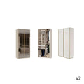 Модул V2 е отлично решение за оптимална подредба, благодарение на своето богато вътрешно разпределение и функционалност. С размери широчина 102 см / дълбочина 62 см / височина 231 см, той предлага множество рафтове, две зони с лостове за висящи дрехи, изтеглящ се органайзер и вградена закачалка за панталони. Всеки детайл е създаден с мисъл за практичност и стил. Предлага се с избор между стъклени врати от опушено стъкло с метална златна рамка или плътни врати от лакобел, които допълват изисканата визия на гардероба.