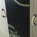Дизайнът е вдъхновен от military тема и се отличава с покривна форма, корпус в дървесен тон, фронтове в матово зелено и централен черен панел с графика. Въжените дръжки и декоративните отвори допълват визията и правят модела подходящ за момчешка стая с по-характерно и завършено излъчване. Camp е добър избор, ако търсите гардероб за тийн стая, който да дава практично съхранение и да се вписва в тематично обзавеждане.