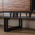 ТВ модулът е изработен от МДФ с естествен фурнир и метална основа, което дава комбинация от топла дървесна визия и стабилна конструкция. Високите крака улесняват почистването и позволяват робот-прахосмукачка да минава отдолу, а затворените обеми дискретно скриват кабели, техника и дребни вещи. Горните модули с огледална и плътна врата добавят вертикален акцент, повече място за съхранение и усещане за „облечена“ стена, без да я правят тежка.