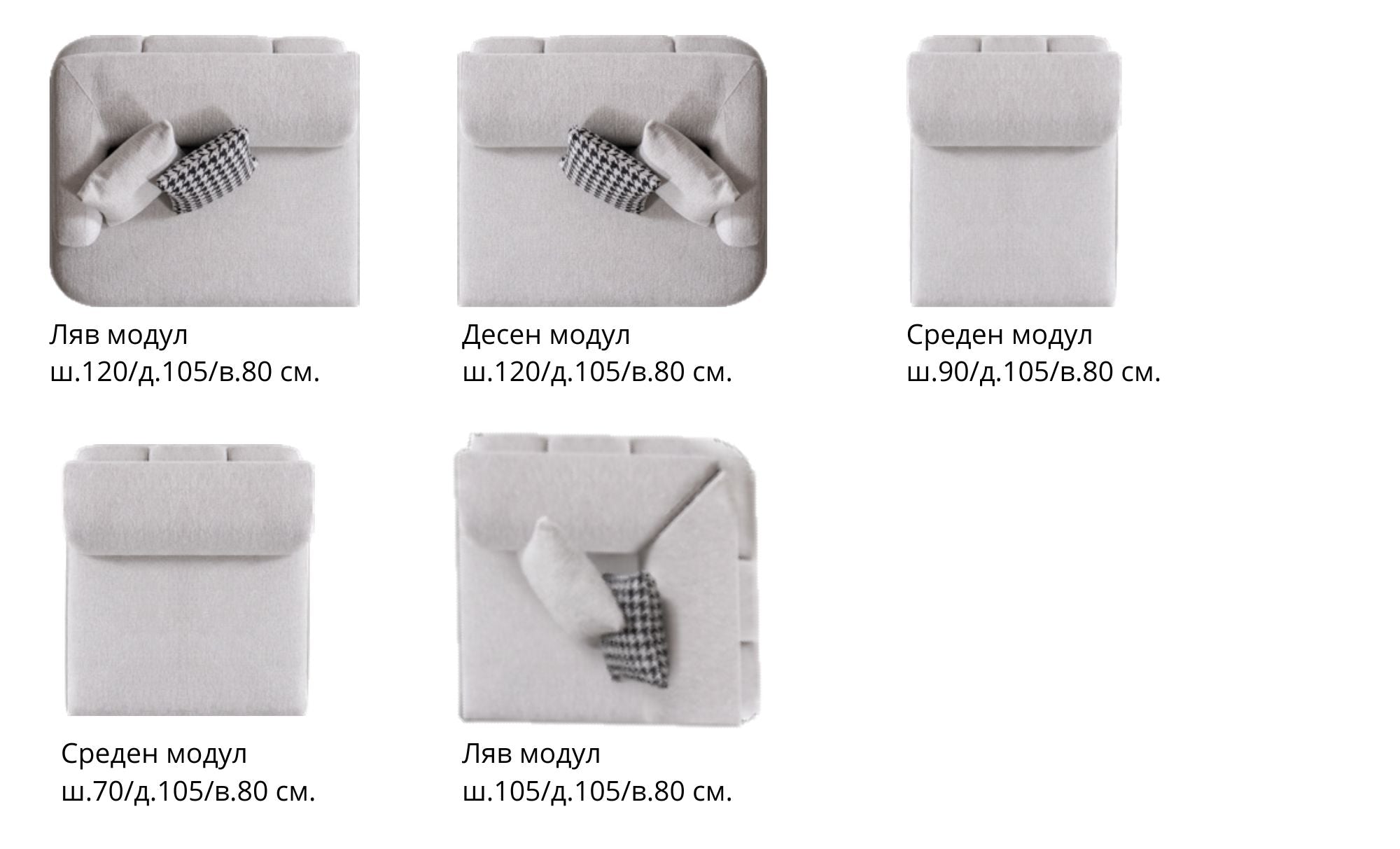 - Ляв / Десен модул с подлакътник: ш.120/д.105/в.70 см.