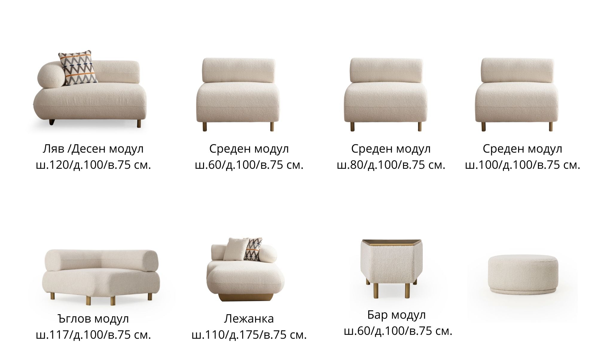 • Ляв / Десен модул с подлакътник: ш.120/д.115/в.74 см.