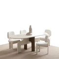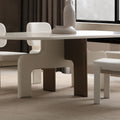Трапезна маса Molivo съчетава елегантен овален плот с уникална основа, създавайки неповторим фокус в съвременната трапезария. Плотът е гладък и просторен, а в централната част има декоративна вложка с каменен ефект, която придава характер и стил. Скулптурната основа е изработена от два различни елемента – светъл, плавно извит елемент и тъмен правоъгълен панел – които осигуряват стабилност и визуален баланс. Благодарение на размерите си масата предлага достатъчно място за семейни събирания, като удобните извивки на плота улесняват разполагането на столове. Дизайнът позволява лесно съчетаване с различни стилове и материали, а висококачествената изработка гарантира дълготрайност и лесна поддръжка. Molivo е идеален избор за всеки, който търси практична, но същевременно артистична маса за своя дом.
