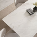 - Дизайн: съвременна трапезна маса с голям правоъгълен плот и скулптурна основа.