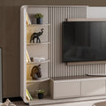 Долният модул е с изчистени врати и отворена крайна ниша, която е удобна за дребни вещи и декоративни акценти. Горният модул добавя вертикален релефен панел и странични отворени рафтове, които правят секцията по-завършена и дават място за книги и декорация. Заоблените линии и светлият тон правят Zen подходяща за модерна дневна с по-спокойна и подредена визия.