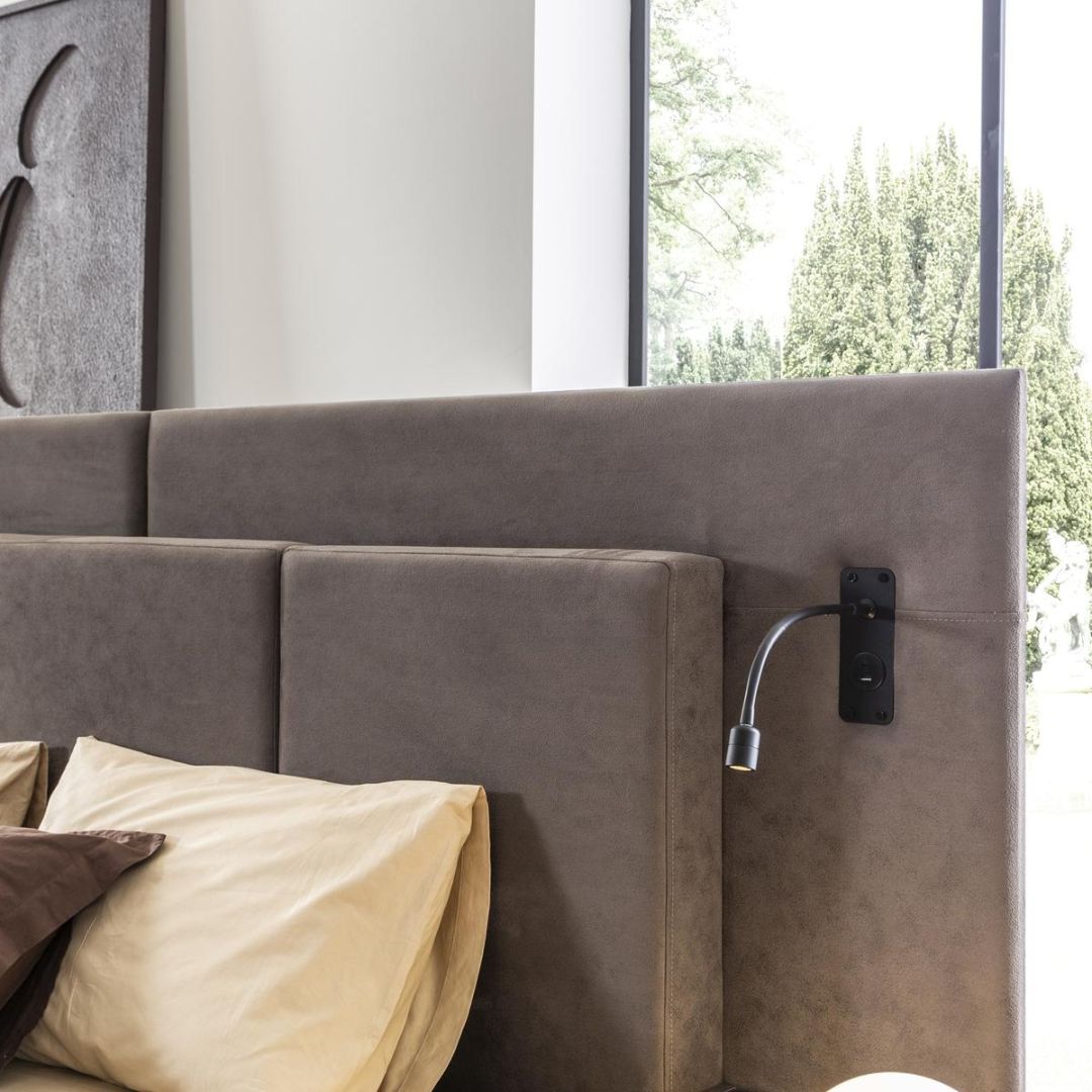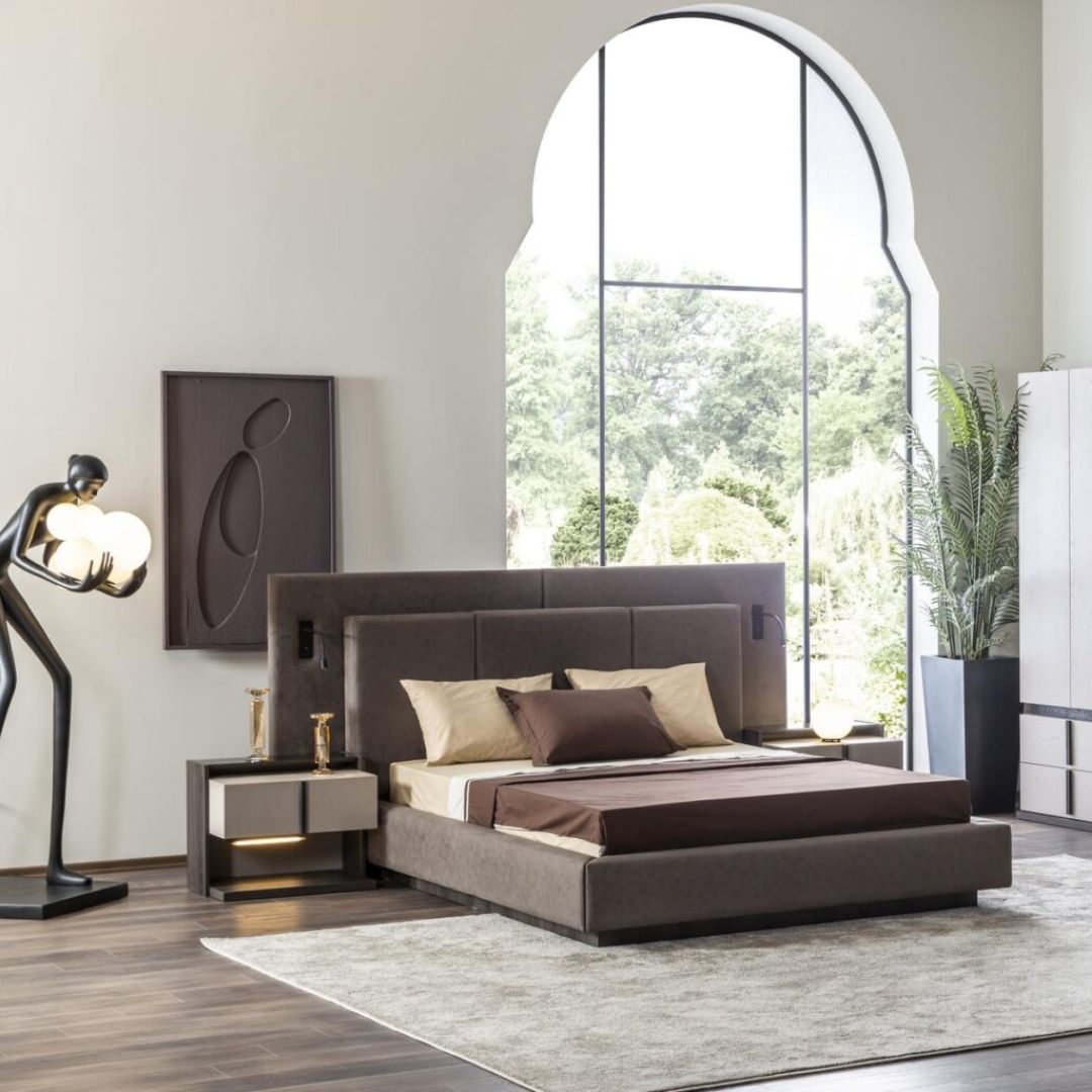 Леглото Vitra комбинира модерна естетика и интелигентна функционалност. Отличава се с висока тапицирана табла с геометричен декоративен мотив и елегантни златисти елементи, които придават изискан завършек на спалнята. Подходящо е както за съвременни, така и за класически интериори. Вградената ракла с повдигащ механизъм осигурява допълнително място за съхранение, без да нарушава стилния силует на модела.