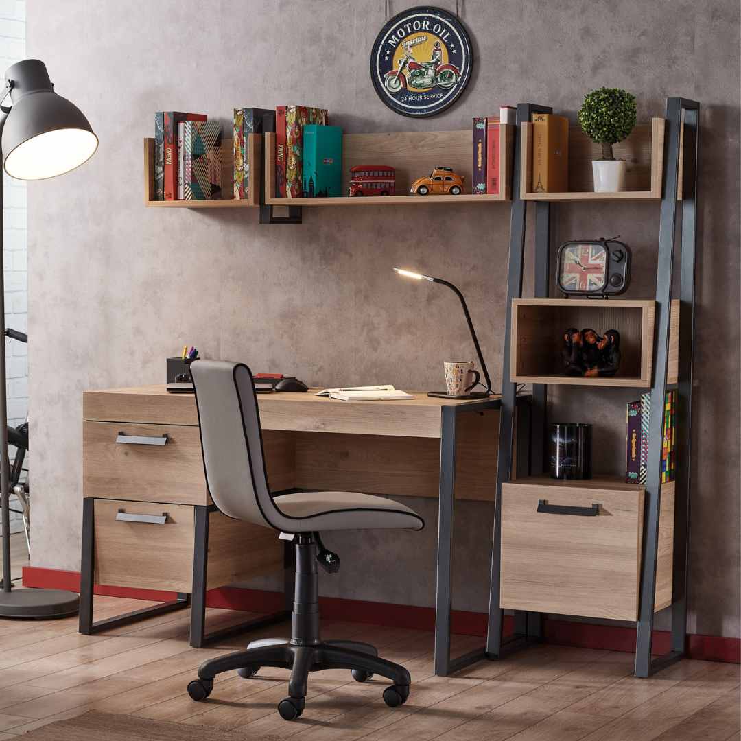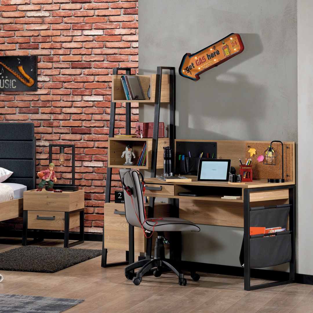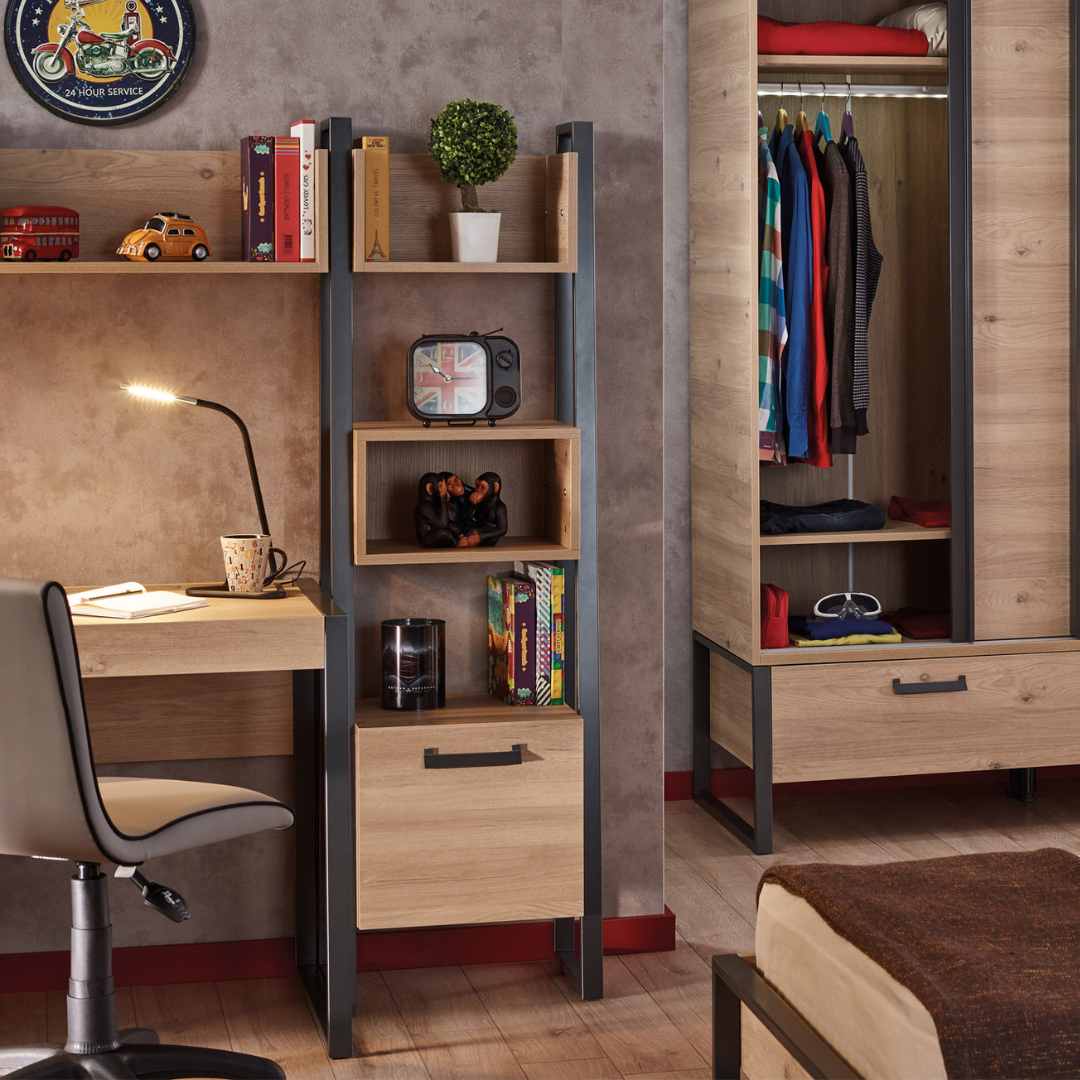 Библиотека Irony представлява елегантно и практично допълнение за детската стая. Съчетавайки стил и функционалност, тази библиотека предоставя пространство за книги, играчки или декорации, допълващи интериора на стаята. Индустриалния стил на колекцията е подходящ за тийн стая.