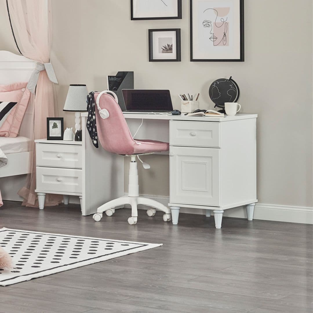 Детско бюро Lora е създадено с мисъл за стил и практичност. Идеално за ученици и малки творци, това детско бюро предлага удобна работна повърхност и достатъчно място за съхранение. С изчистен дизайн в бяло и стабилна конструкция от качествени материали, то се вписва перфектно във всяка модерна детска стая. Подходящо както за момичета, така и за момчета, детско бюро Lora насърчава организираността и креативността. Поръчай сега и създай комфортно място за учене и игра!