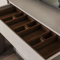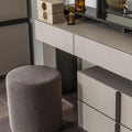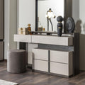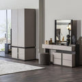 Тоалетката с огледало и табуретка Vitra предлага стил, изящество и удобство в едно. Със своята тапицирана табуретка, геометрично декорирани чекмеджета и изчистено огледало, тя се превръща в практично и красиво допълнение към всяка модерна спалня. Компактна, но функционална, тоалетката предоставя нужното място за съхранение на козметика, аксесоари и бижута, като същевременно допринася за цялостната естетика на помещението.