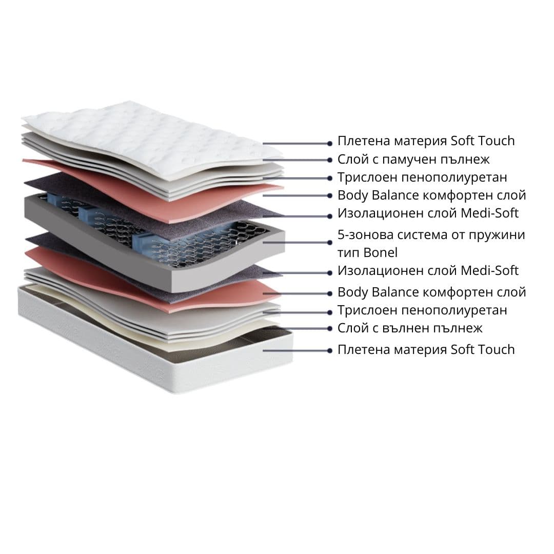 Еластичната повърхност и иновативната структура с гъста пяна и въздушни канали позволяват циркулация на въздуха и предотвратяват запарване. Матракът съчетава устойчивост, здравина и отлична абсорбация на движенията, като същевременно е нежен към кожата и не предизвиква алергии.