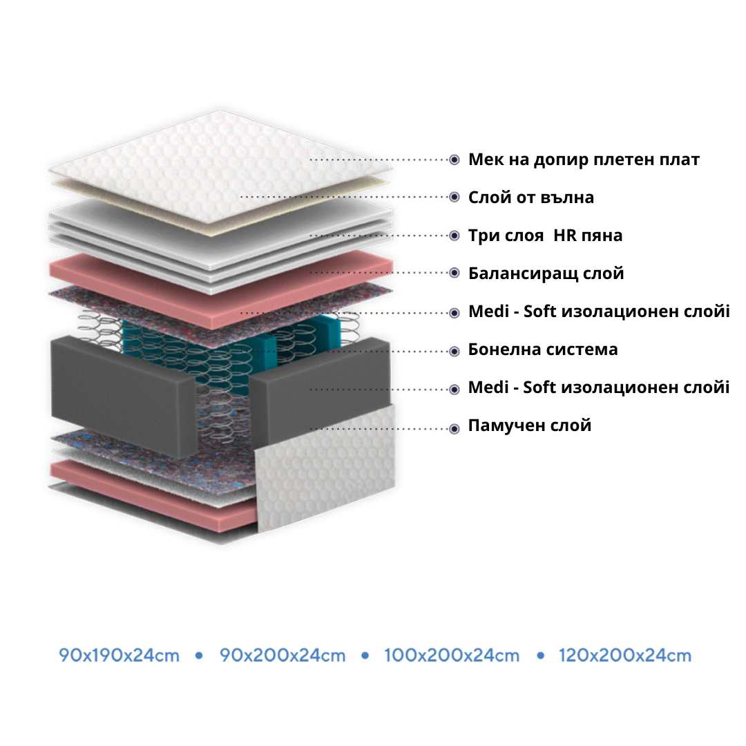 Еластичната повърхност и иновативната структура с гъста пяна и въздушни канали позволяват циркулация на въздуха и предотвратяват запарване. Матракът съчетава устойчивост, здравина и отлична абсорбация на движенията, като същевременно е нежен към кожата и не предизвиква алергии.