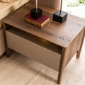 Нощното шкафче Tilsim е стилно допълнение към всяка модерна спалня, съчетаващо изчистен дизайн с изтънчени детайли. Златистите акценти и геометричният фронт придават характерен израз на шкафа, докато двете чекмеджета осигуряват необходимото пространство за съхранение на лични вещи. Перфектно се комбинира с останалите елементи от серията Tilsim за постигане на завършен и хармоничен интериор.