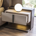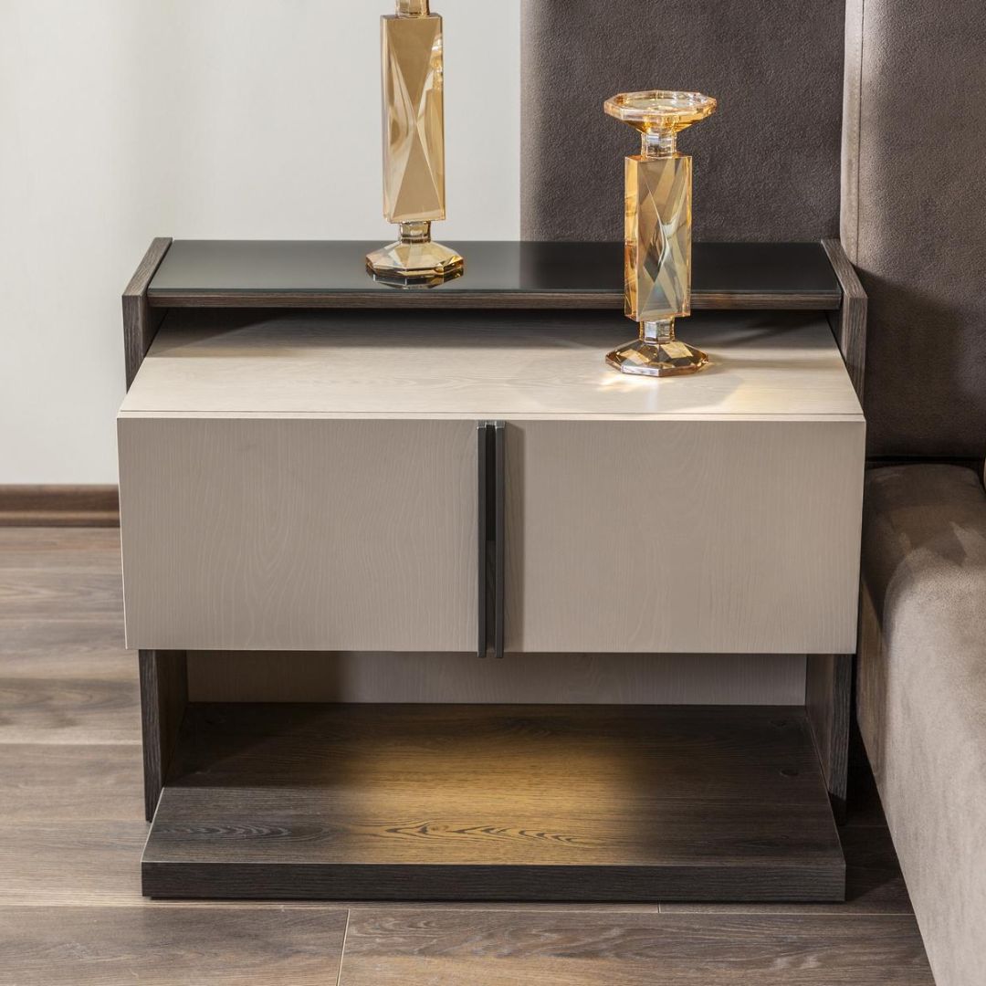 Нощното шкафче Vitra е стилен и практичен елемент, който допълва леглото от същата серия с елегантен баланс между функционалност и дизайн. Съчетава изчистени линии, фини златисти акценти и геометричен декоративен фронт, който подчертава модерната естетика. Двете чекмеджета предлагат удобно пространство за съхранение на лични вещи до леглото.