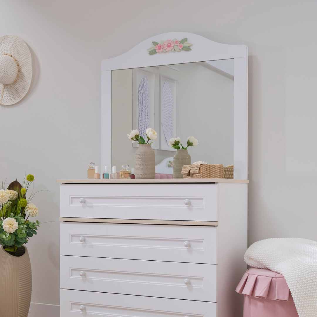 Огледало за скрин Bianca е практично и стилно допълнение към детската стая. Той предоставя удобство и функционалност, допълнително осигурявайки пространство за грижа за външния вид. Изработено от висококачествени материали, това огледало е идеално за съчетаване на практичност с дизайн в интериора на стаята на вашето дете.