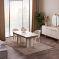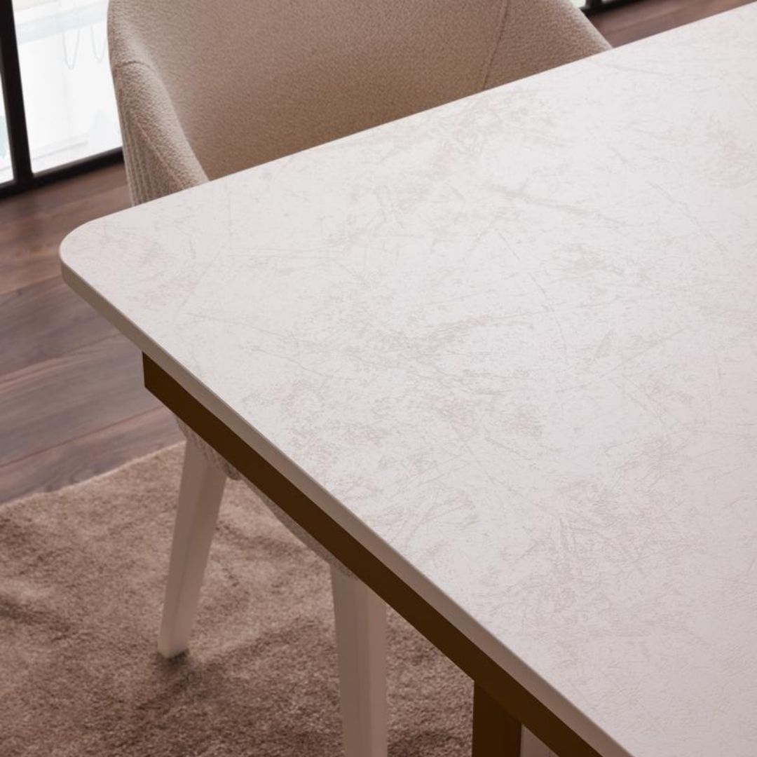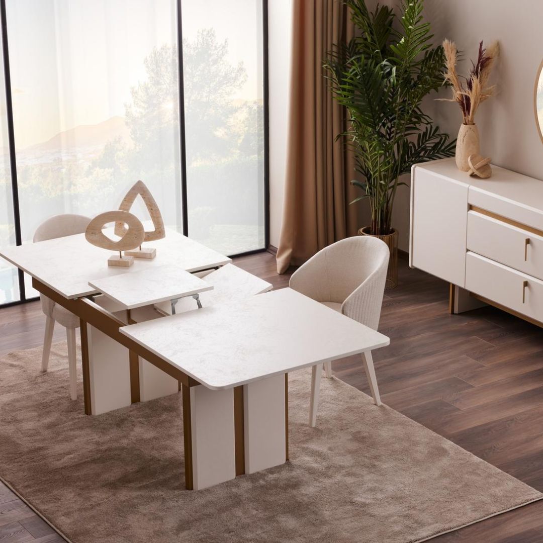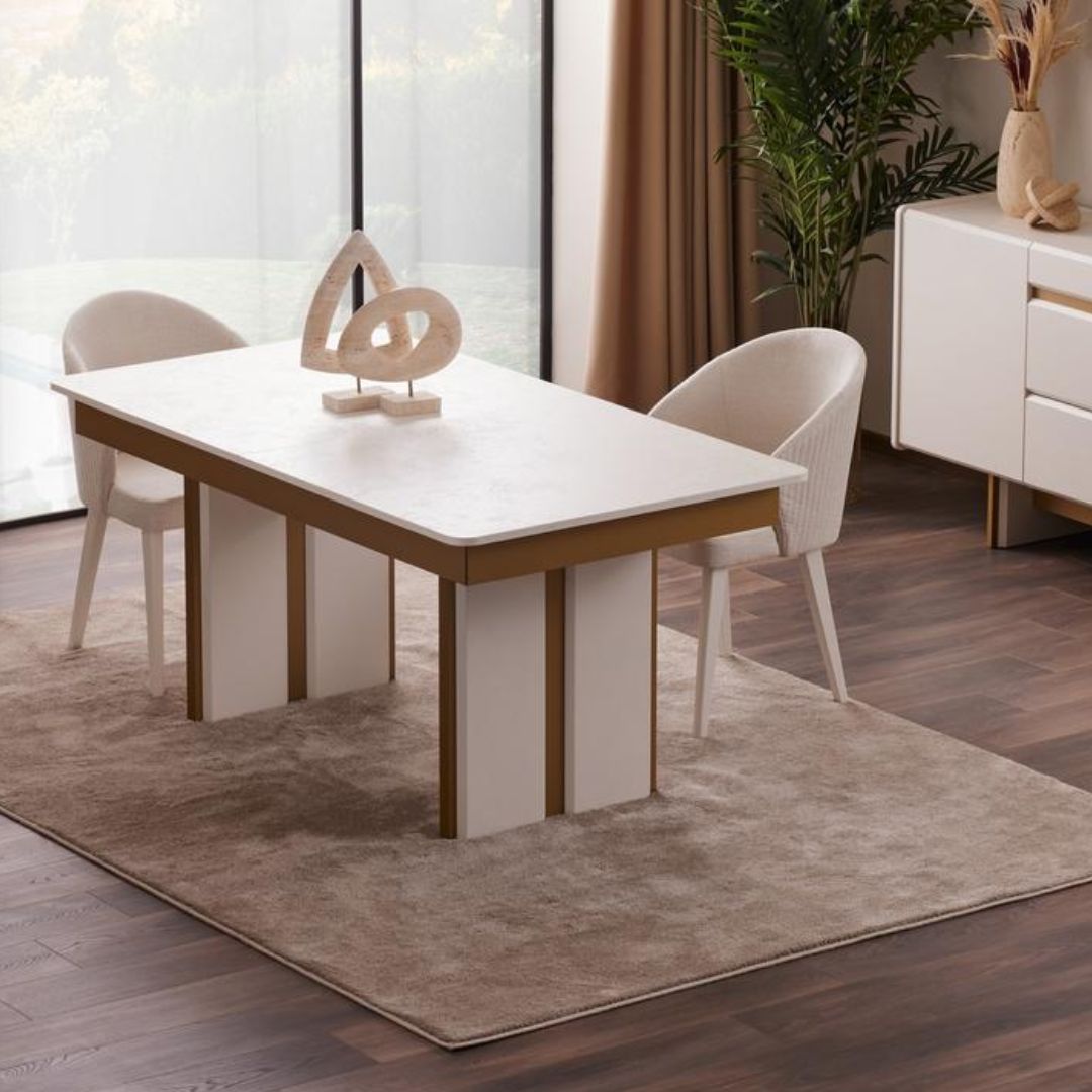 Трапезната маса Loren е съчетание на изтънчен модерен стил и стабилна конструкция. Създадена да бъде елегантен акцент в трапезарията, тя разполага с изчистени линии, фина цветова комбинация от бяло и златисто, както и стабилен централен крак с декоративни панели. Подходяща е както за ежедневно използване, така и за специални поводи.